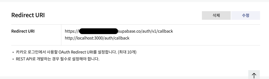차이점이라면 Redirect URI에 supabase가 처리해주는 url(https://<project-ref>.supabase.co/auth/v1/callback)을 추가해준다. 그리고 Kakao Client ID와 Kakao Client Secret