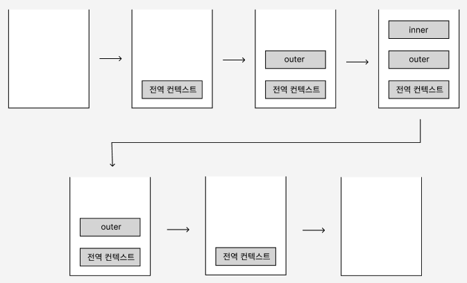 inner 함수의 실행이 종료되면 inner 컨텍스트가 콜 스택에서 제거되고 일시중단되었던 outer 함수의 실행이 이어지고 순차적으로 전역 컨텍스트가 콜 스택에서 제거되면 종료된다.