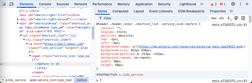 ::before와 ::after에 바탕 이미지의 좌표와 메일 이미지 좌표를 불러와서 아이콘을 만든 것을 알 수 있다.