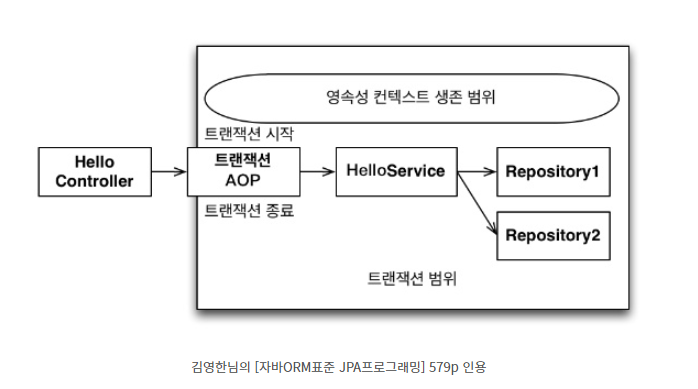 스프링 컨테이너는 트랜잭션 범위의 영속성 컨텍스트 전략을 기본으로 사용한다. 서비스 클래스에서 @Transactional을 사용할 경우, 해당 코드 내의 메서드를 호출할 때 영속성 컨텍스트가 생긴다는 뜻이다. 영속성 컨텍스트는 트랜잭션 AOP가 트랜잭션을 시작할 때 생겨나고, 메서드가 종료되어 트랜잭션 AOP가 트랜잭션을 커밋할 경우 영속성 컨텍스트가 flush되면서 해당 내용이 반영된다. 이 후, 영속성 컨텍스트 역시 종료되는 것이다.