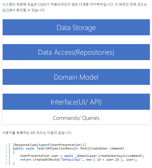POST HTTP 요청을 통해 CreateUser 명령을 입력받아 도메인 계층에 전달하고 명령이 완료되면 201(Created) 응답을 반환한다. 응답에는 생성된 자원의 위치를 나타내는 location 헤더와 생성된 사용자 엔터티에 대한 본문이 포함된다. 이것은 자원을 생성하는 Web API의 흔한 동작입니다. 이 동작을 지원하기 위해 도메인 계층의 reateUserAsync() 메서드는 명령 실행 후 UserPresentation 개체를 반환한다.
