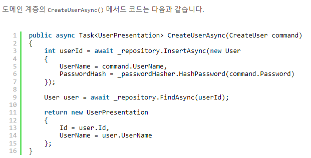 CreateUserAsync() 메서드는 크게 두 가지 작업을 수행한다. 첫번째는 CreateUser 명령에 들어있는 정보를 사용해 새 사용자 엔터티를 생성하는 것이고, 두 번째는 생성된 사용자 엔터티를 조회해 표현 계층 모델로 변환해 반환하는 것이다. 영속 모델(User) 개체를 그대로 반환하면 PasswordHash 속성이 서비스 외부로 노출되는 보안 문제가 발생한다.