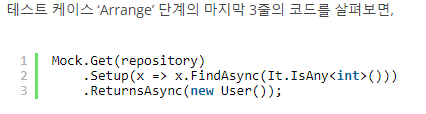 테스트 케이스가 검증하고자하는 내용과는 무관한 것을 알 수 있다. 테스트 케이스의 관심사는 새 엔터티가 잘 추가되는지이지 메서드가 어떤 값을 반환하는지가 아니다. 반환값에 대한 검증은 별도의 테스트 케이스가 필요하다. 하지만 위 코드가 빠지면 실제 코드에 문제가 없음에도 불구하고 NullReferenceException이 발생해 테스트 케이스가 실패한다. 저장소에 대한 테스트 대역이 FindAsync() 메서드 호출에 대해 null 참조를 반환하기 때문이다.