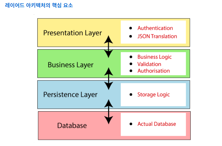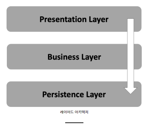 레이어드 아키텍쳐의 핵심 요소는 '단방향 의존성' 이다. 각각의 레이어는 오직 자기보다 하위에 있는 레이어에만 의존한다. 그러므로 presentation layer는 business layer에게 의존하고, business layer는 persistence layer에게만 의존하게 된다.