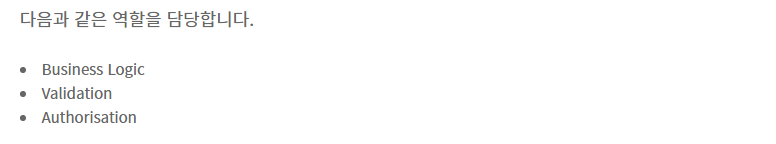 해당 시스템을 사용하는 사용자 혹은 클라이언트 시스템과 직접적으로 연결되는 부분이다. 웹사이트에서는 UI 부분에 해당하고 백엔드 API에서는 엔드포인트 부분에 해당한다. 그러므로 presentation layer에서 API의 엔드포인트들을 정의하고 전송된 HTTP 요청(request)를 읽어 들이는 로직을 구현한다. 그러나 그 이상의 역할은 담당하지 않는다. 실제 시스템이 구현하는 비즈니스 로직은 다음 레이어로 넘기게 된다.