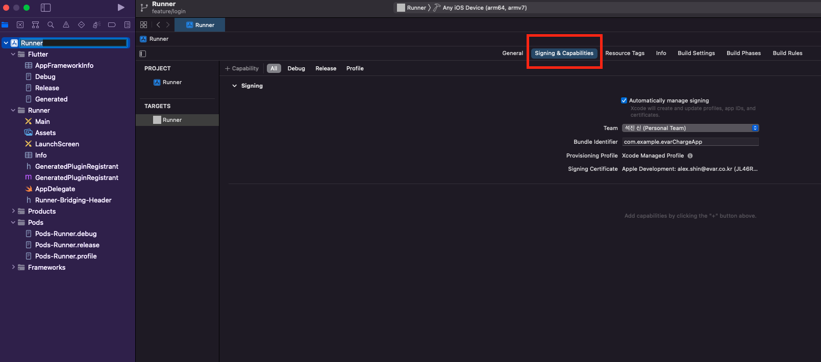 xcode에서 해당 프로젝트의 Runner.xcodeproj를 연다.