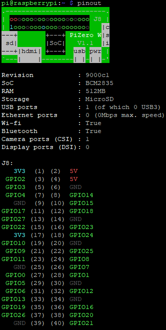 pinout 명령을 사용하면 현재 라즈베리파이의 정보와 pin 정보가 출력된다.