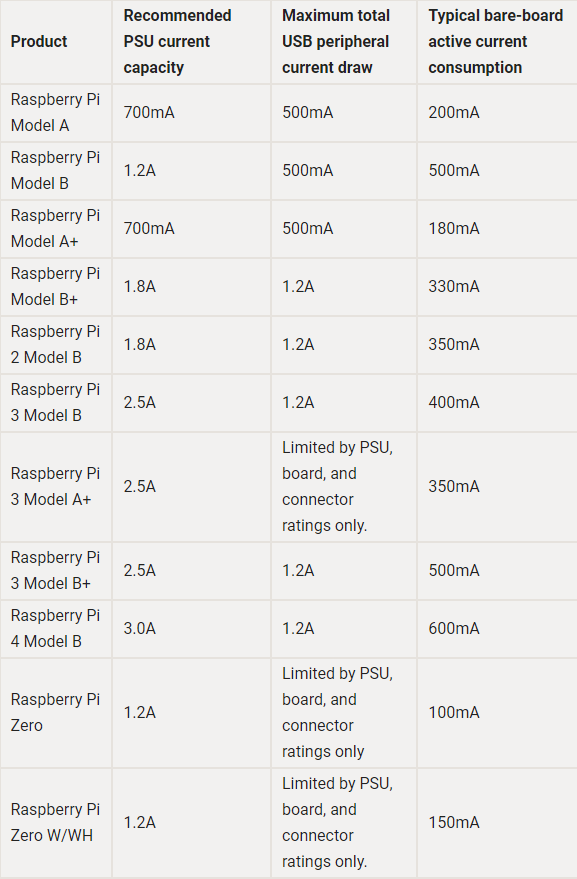 라즈베리 파이의 정격 출력 전류와 구동 전류등의 스펙이다.