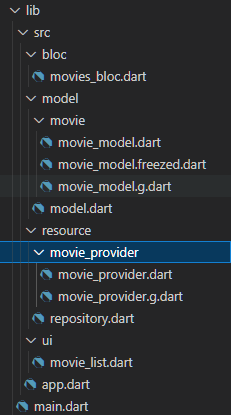 bloc: 레포지토리만 참조 model: freezed, json_serializable 활용 resource: provider폴더의 retrofit 활용 api 요청, 각각의 api 묶음을 resource 최상위 폴더의 repository에서 관리 ui: Stream 빌더로 화면을 구성