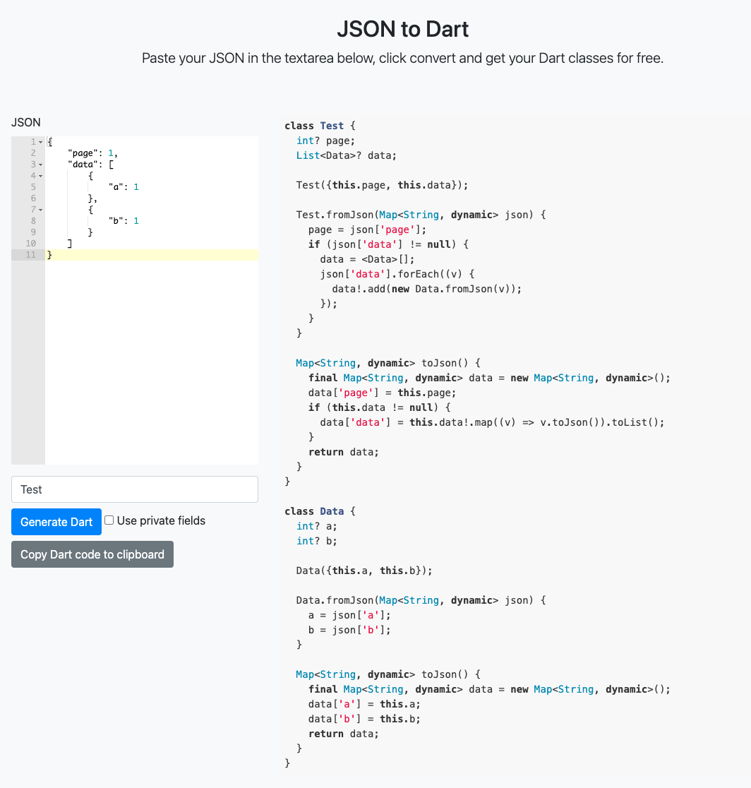 예시의 경우 test.dart라는 이름의 파일로 진행하였다. JSON to dart에서 프로퍼티와 생성자 부분만 복사해오자.