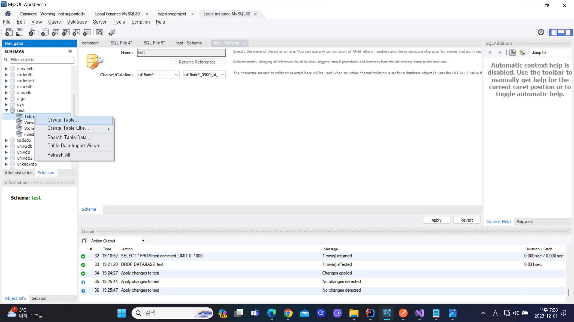 우리가 생성한 스키마를 누르고 테이블에서 오른쪽 마우스를 클릭한 뒤 테이블 생성을 클릭하면 됩니다.