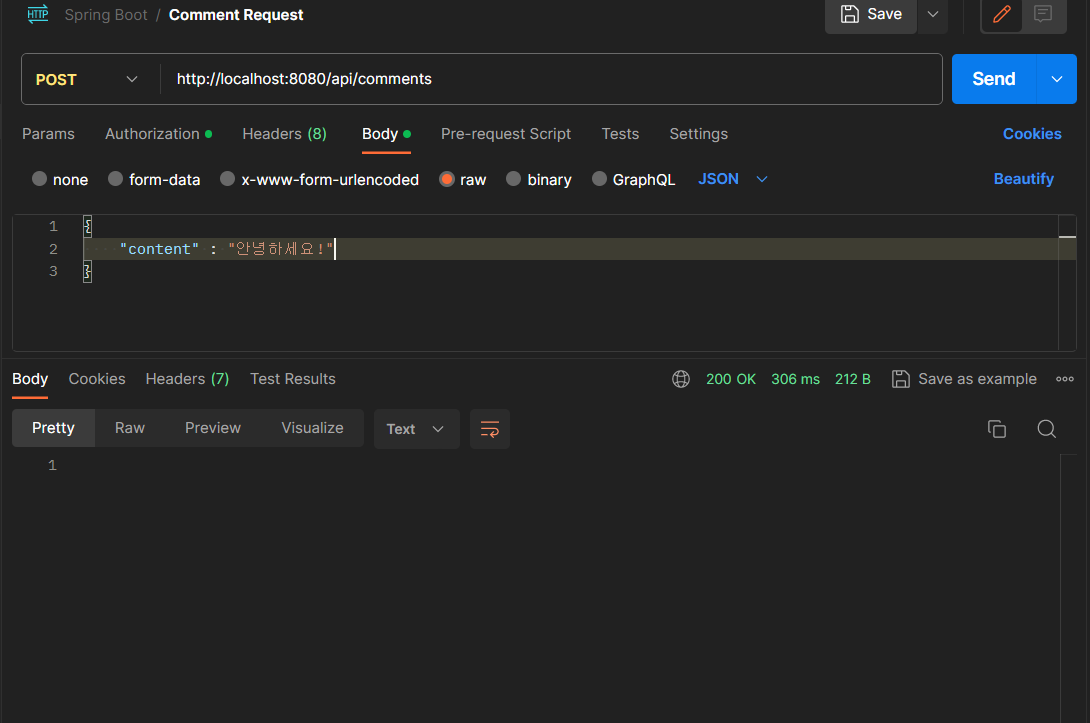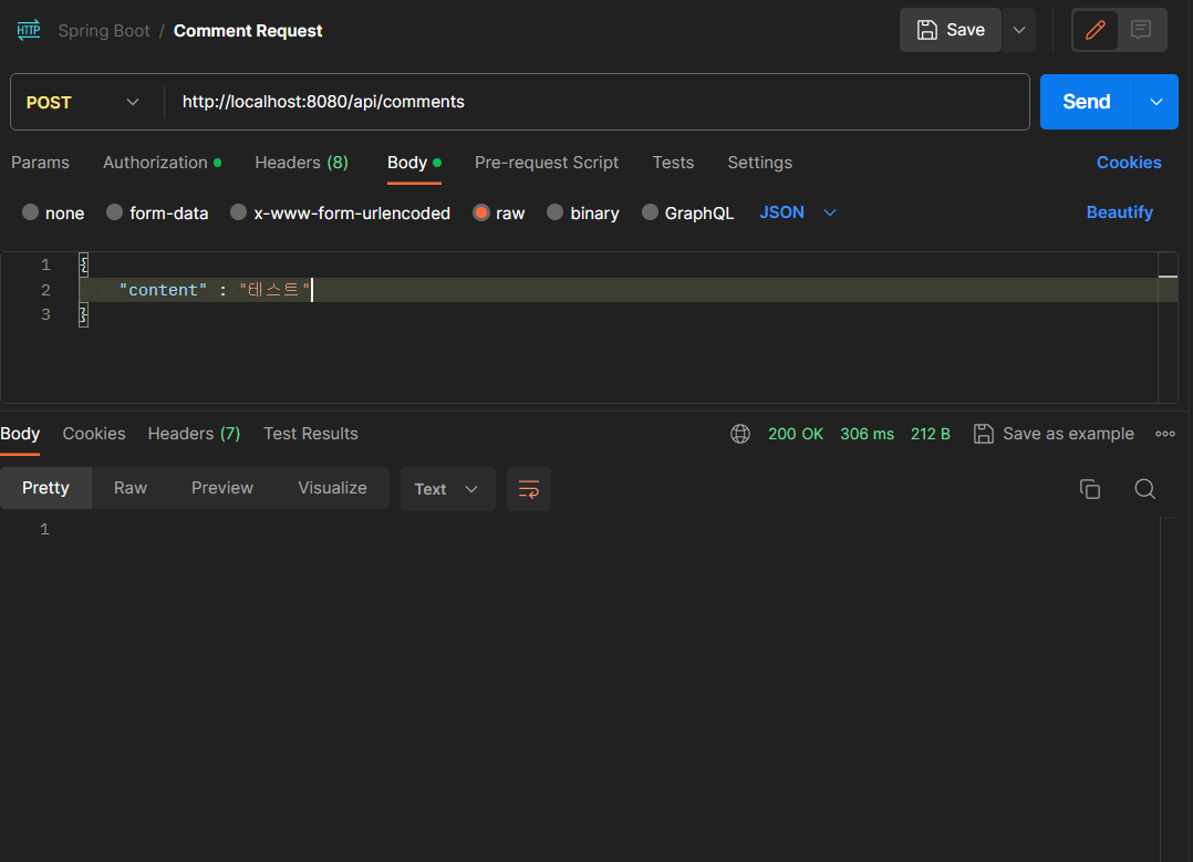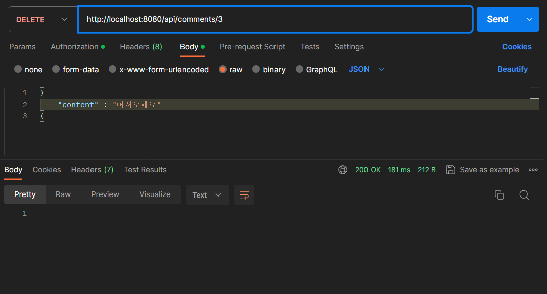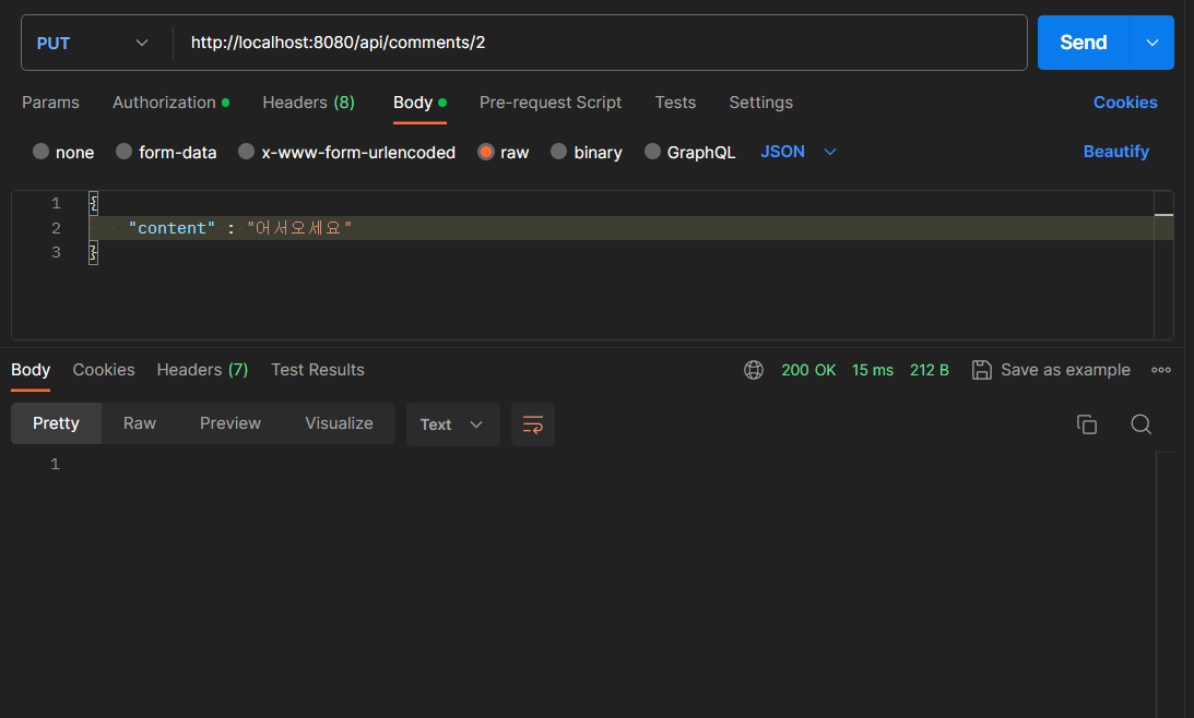 요청을 PUT으로 설정해주고 마찬가지로 컨트롤러에서 설정한 url인 commments 뒤에 수정하고싶은 댓글의 ID를 입력합니다. 그러고 댓글의 내용을 원하는 내용으로 적어주고 send 요청을 보냅니다.