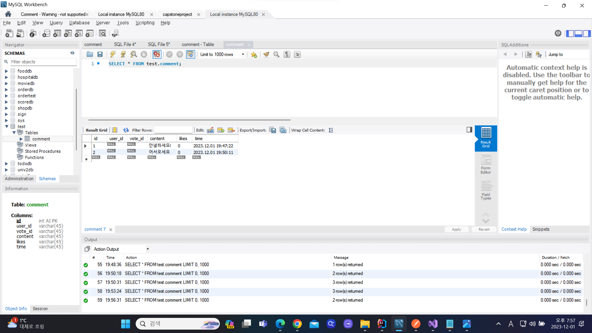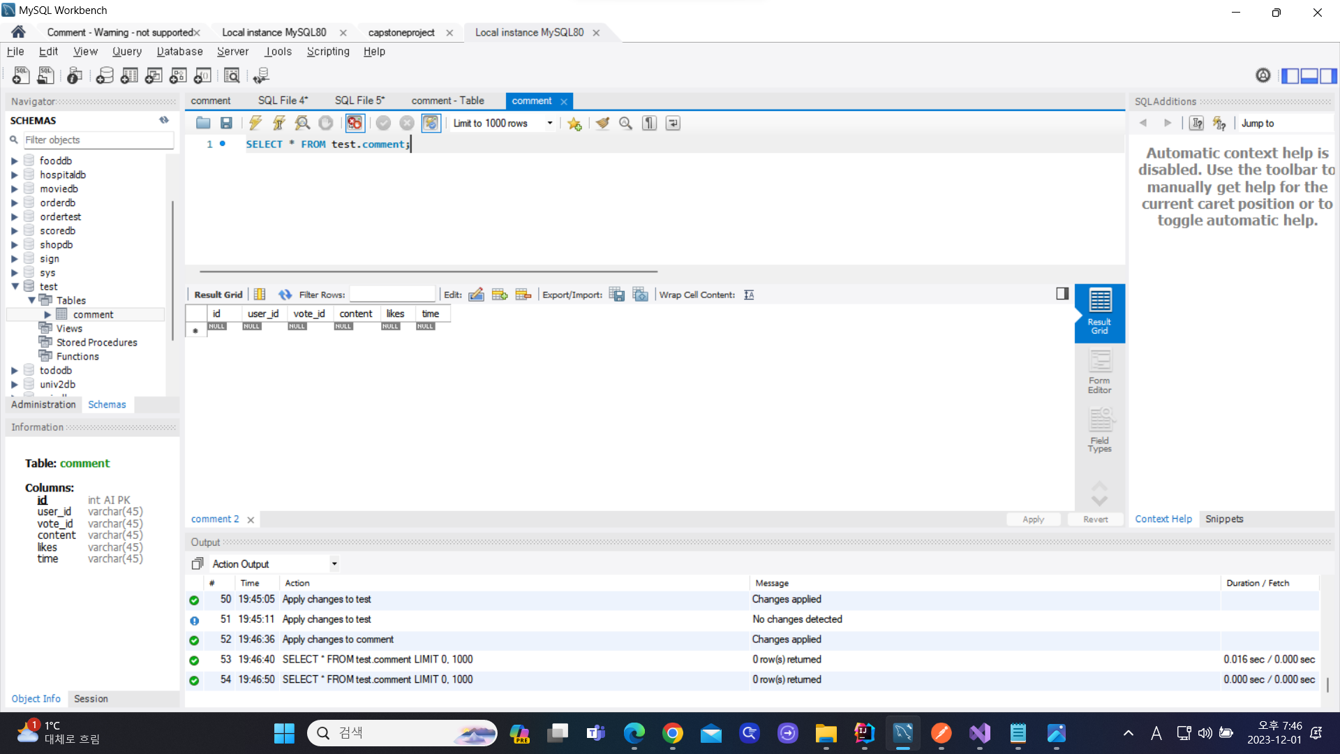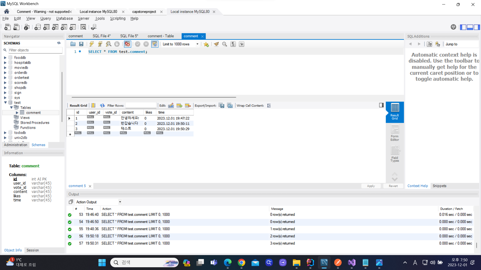 이번엔 간단한 댓글 데이터 구현해보기가 주제이니 여기서 userId와 voteId값은 아직 외래키를 연결하지 않았으므로 null값을 주도록 설정하였습니다.