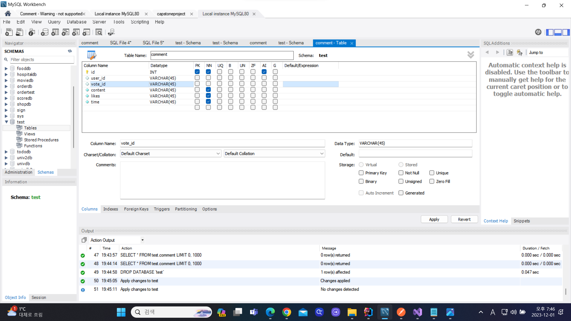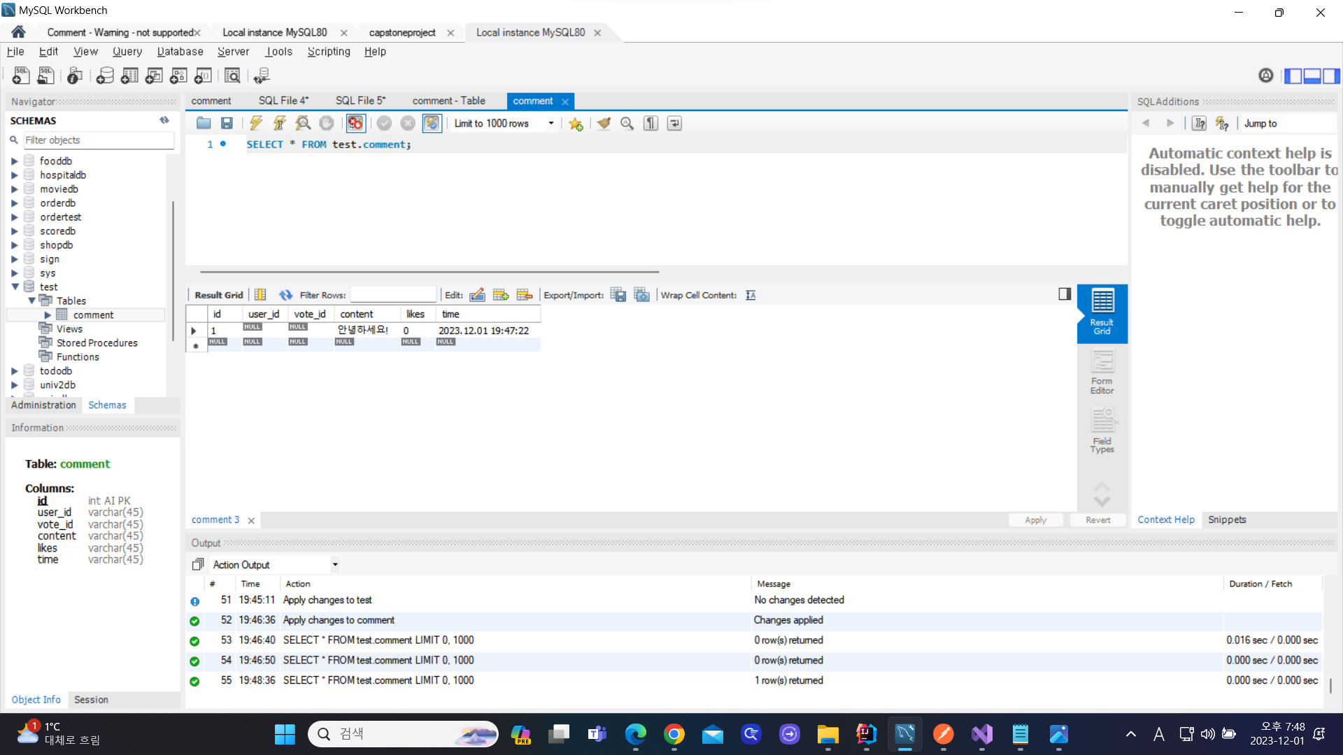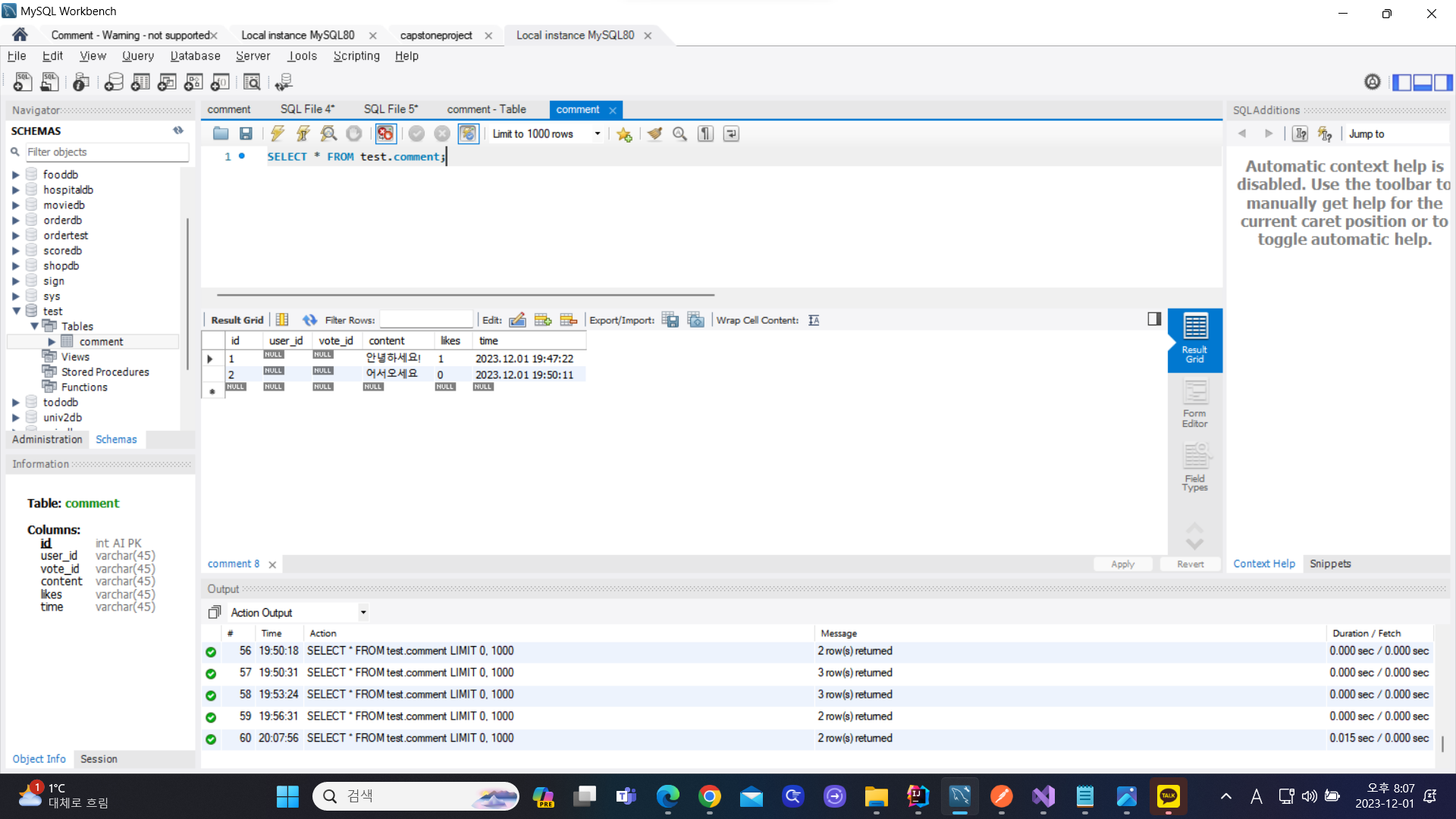 이번엔 간단한 댓글 데이터 구현해보기가 주제이니 여기서 userId와 voteId값은 아직 외래키를 연결하지 않았으므로 null값을 주도록 설정하였습니다.