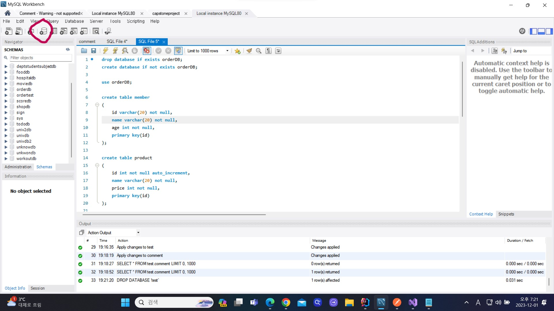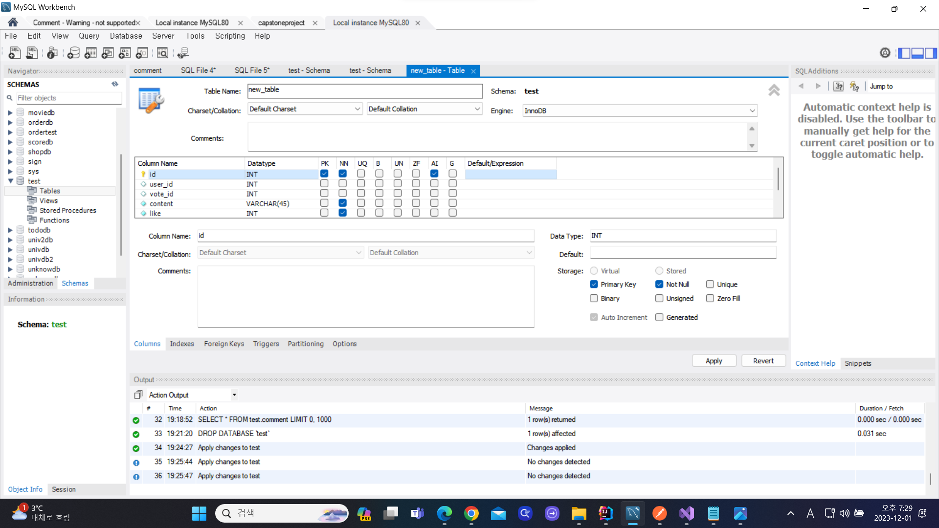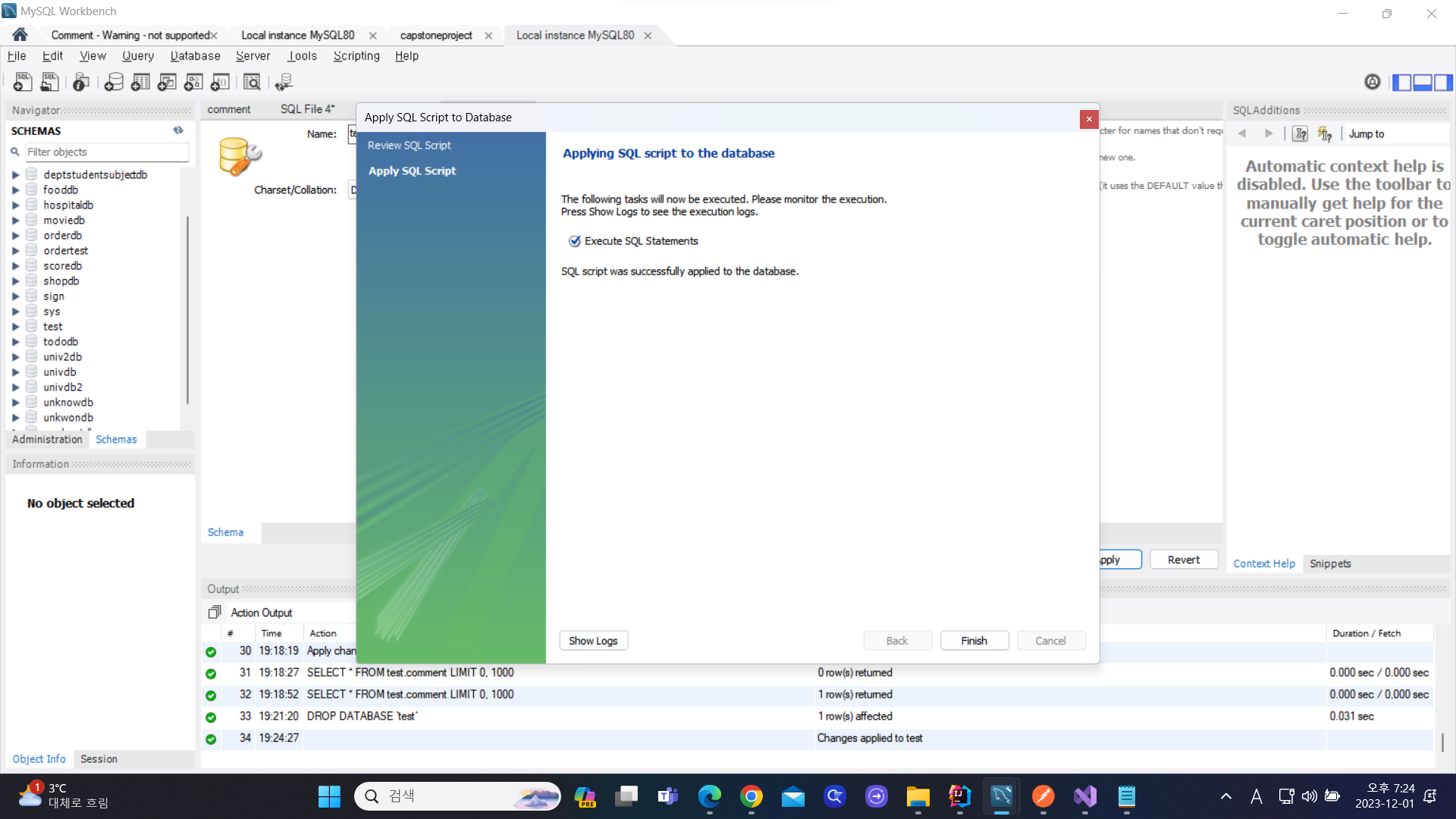 모두 설정을 마치고 Apply 버튼을 누르면 됩니다. 별다른 오류가 없이 좌측 스키마 목록에 우리가 만든 스키마에서 생성한 테이블이 뜬다면 성공!