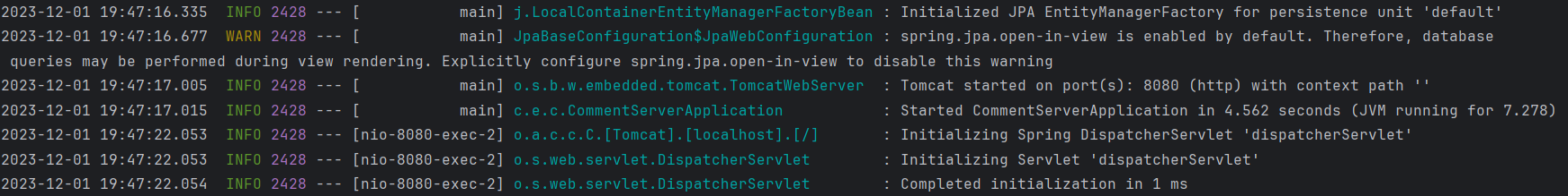 이제 실행을 했을 때 아무런 경고나 오류, 예외 등이 실행창에 나오지않고 위와 같은 Started CommentServerApplication이 실행되었다면 스프링 파일을 실행시키는데 까진 성공한겁니다.
