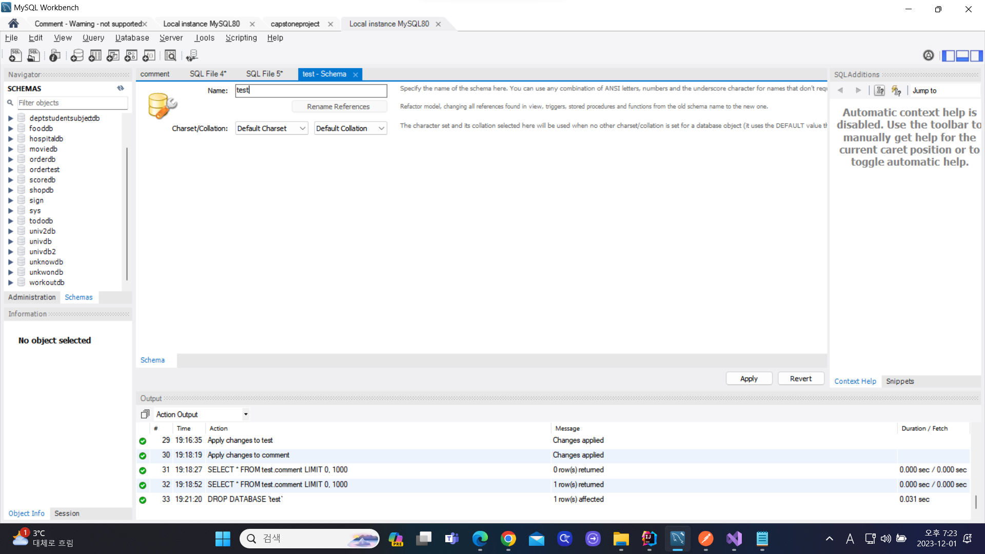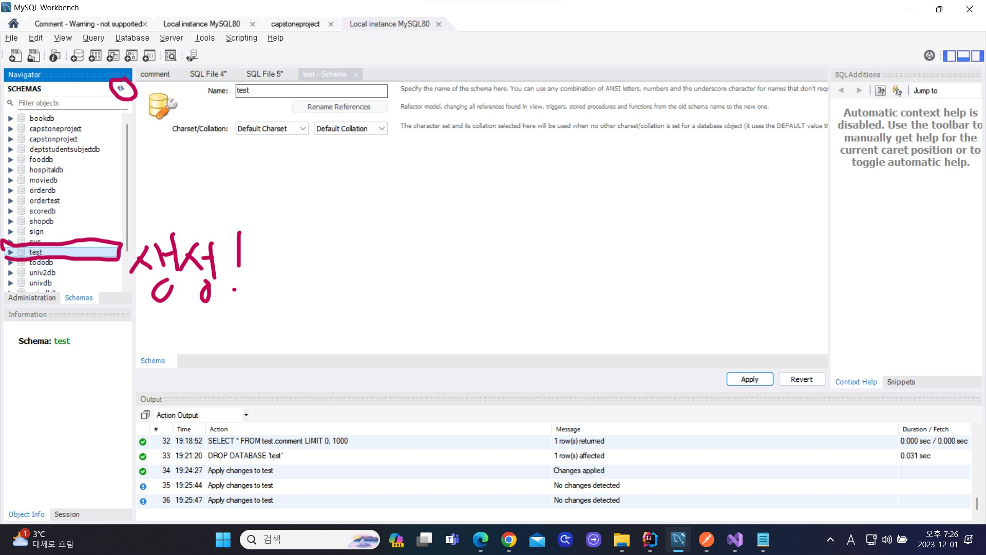스키마 이름을 입력하고 Apply를 누르면 다음과 같은 화면이 나오면 스키마 생성이 된것입니다.