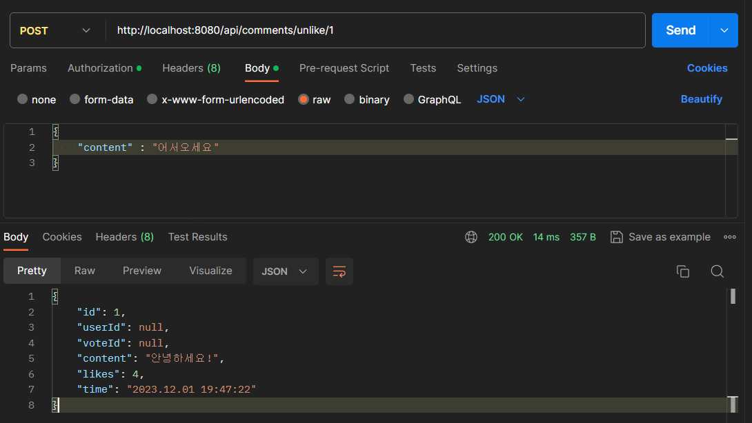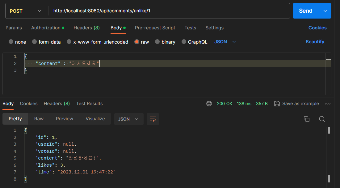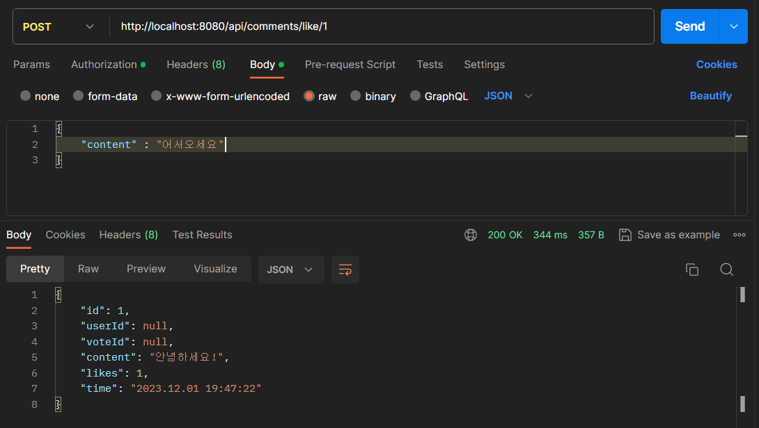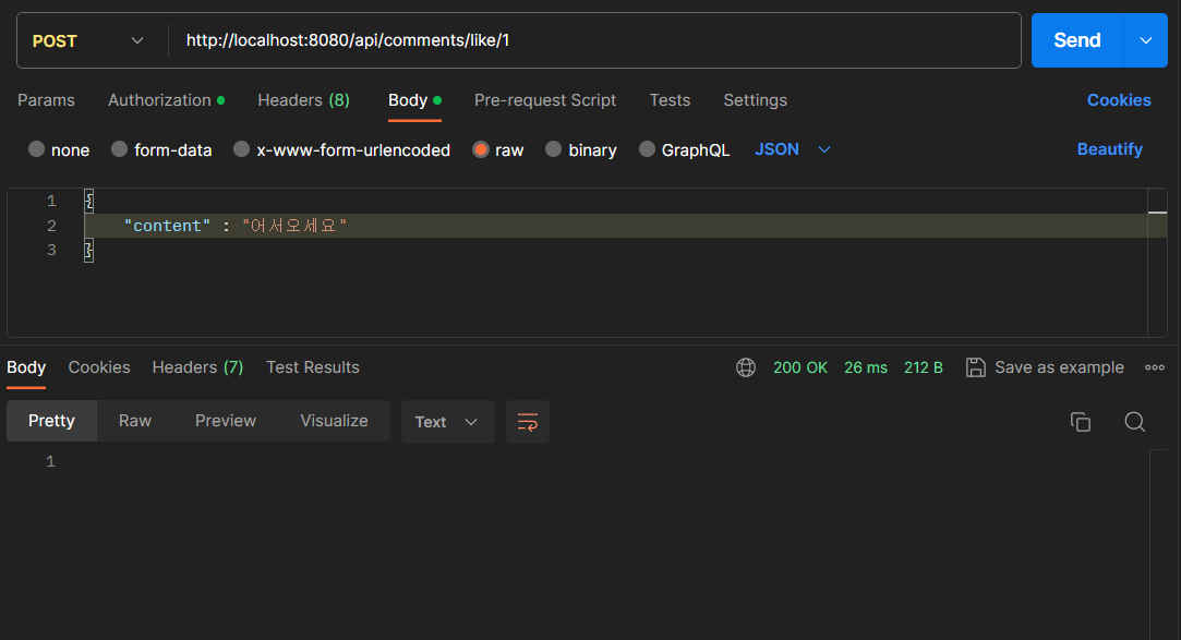 이렇게 POST 요청으로 send 요청을 보내 1번 댓글에 좋아요를 남겨보겠습니다.