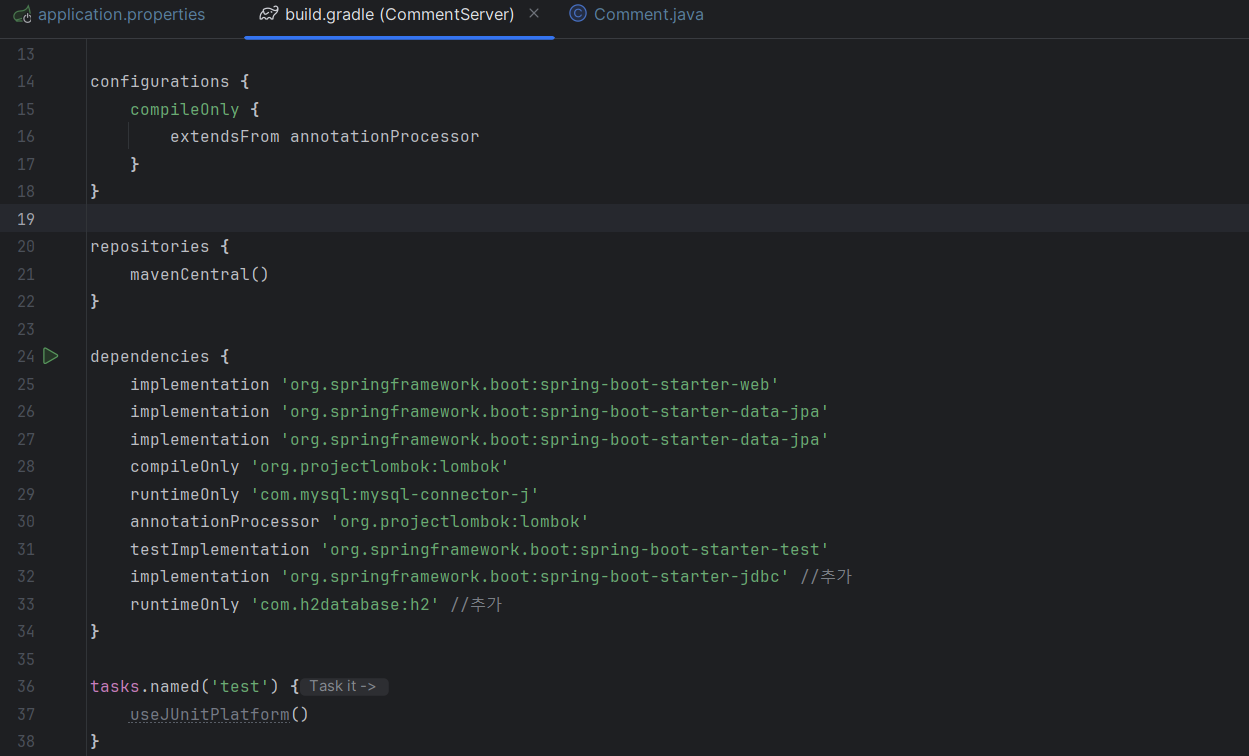 스프링 build.gradle 에서 다음과 같이 의존성을 추가해줍니다.
