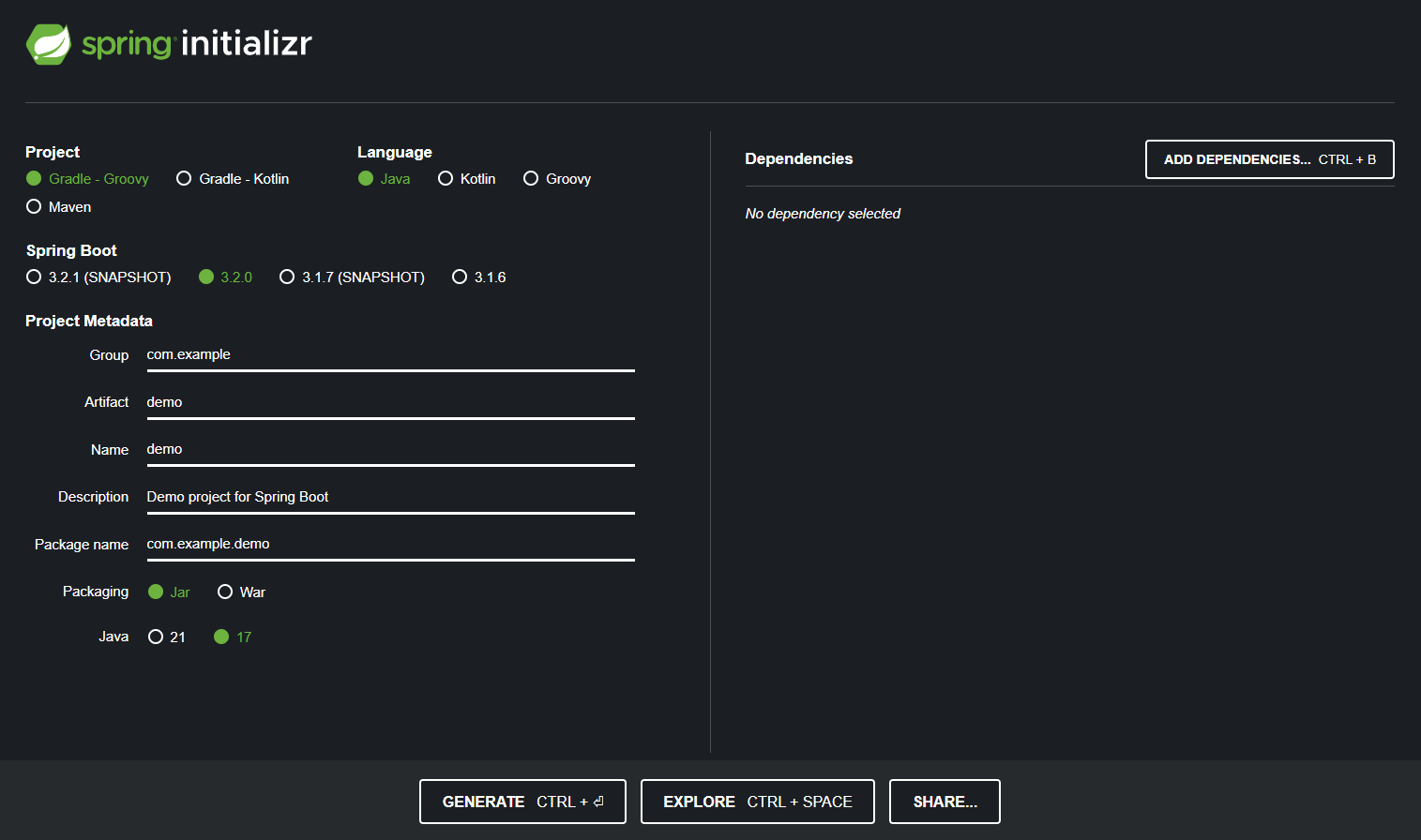 가장 간단한 방법은 Spring Initializer를 이용하여 프로젝트를 생성하는 것이다.