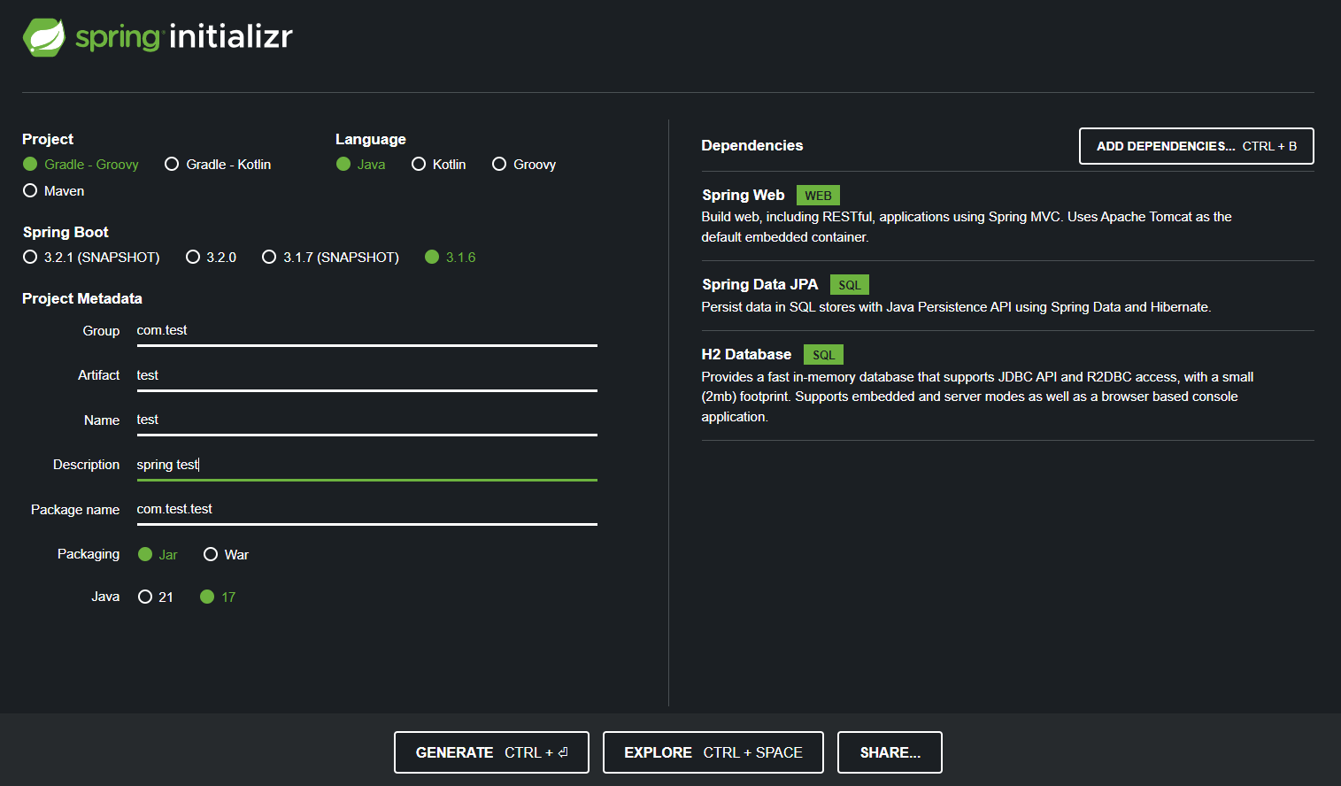 Dependencies에는 스프링 웹(Spring Web), 데이터베이스를 연동하기 위한 Spring Data Jpa, h2 Database나 MySql Driver를 추가해줬다. (다음에 쓸 간단한 CRUD 구현 프로젝트에서는 Mysql workbench가 아닌 h2 console을 사용할 예정이여 h2 Database를 추가해 주었다.)