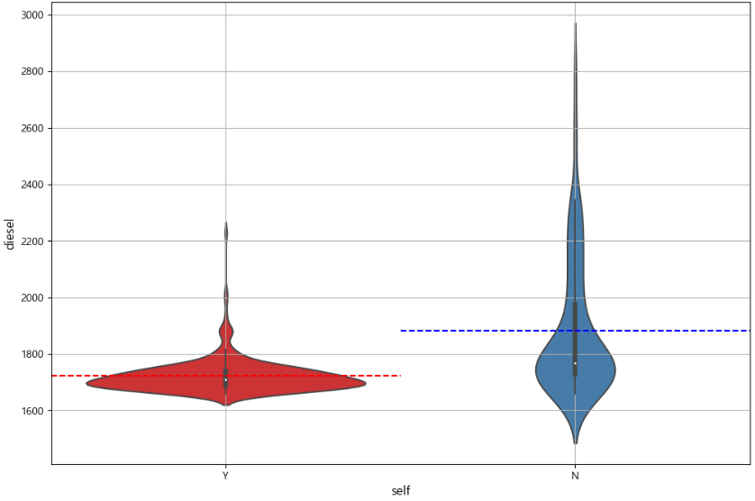 # 경유 plt.figure(figsize=(12, 8)) sns.violinplot(x="is_self", y="diesel", data=df, palette="Set1") plt.axhline(diesel_mean['Y'], color='red', linestyle='--', xmax=0.5, xmin=0) plt.axhline(diesel_mean['N'], color='blue', linestyle='--', xmax=1, xmin=0.5) plt.xlabel('self', fontsize=12) plt.ylabel('diesel', fontsize=12) plt.grid(True) plt.show()