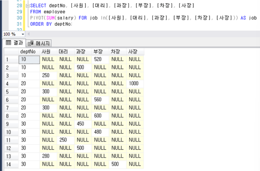 SELECT deptNo, [사원], [대리], [과장], [부장], [차장], [사장] FROM employee PIVOT(SUM(salary) FOR job In([사원], [대리], [과장], [부장], [차장], [사장])) AS job ORDER BY deptNo;
