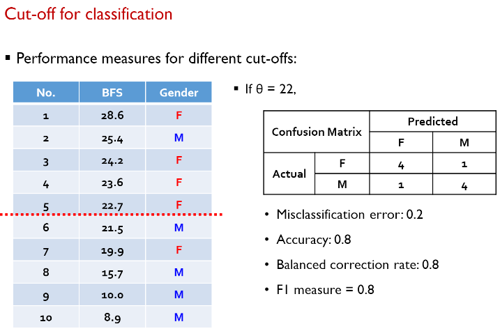 - 타겟에 대한 cut-off를 어떻게 설정하냐에 따라 분류의 결과가 매우 달라짐.
