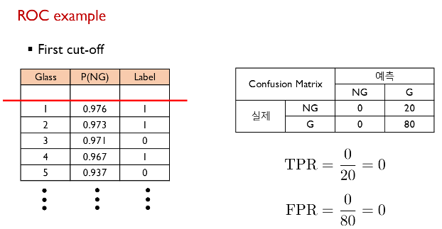 cut-off를 아래로 내릴수록 TPR과 FPR이 높아짐.
