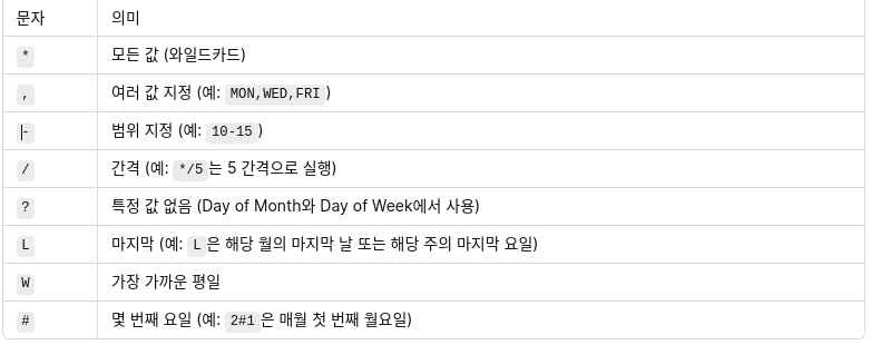 Cron Expression은 공백으로 구분된 6개의 필드로 구성됩니다.