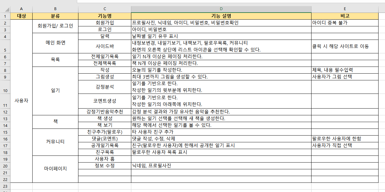 정확한 프로젝트 기획을 위해 사용자 기반의 요구사항 명세서를 먼저 작성해보았다.