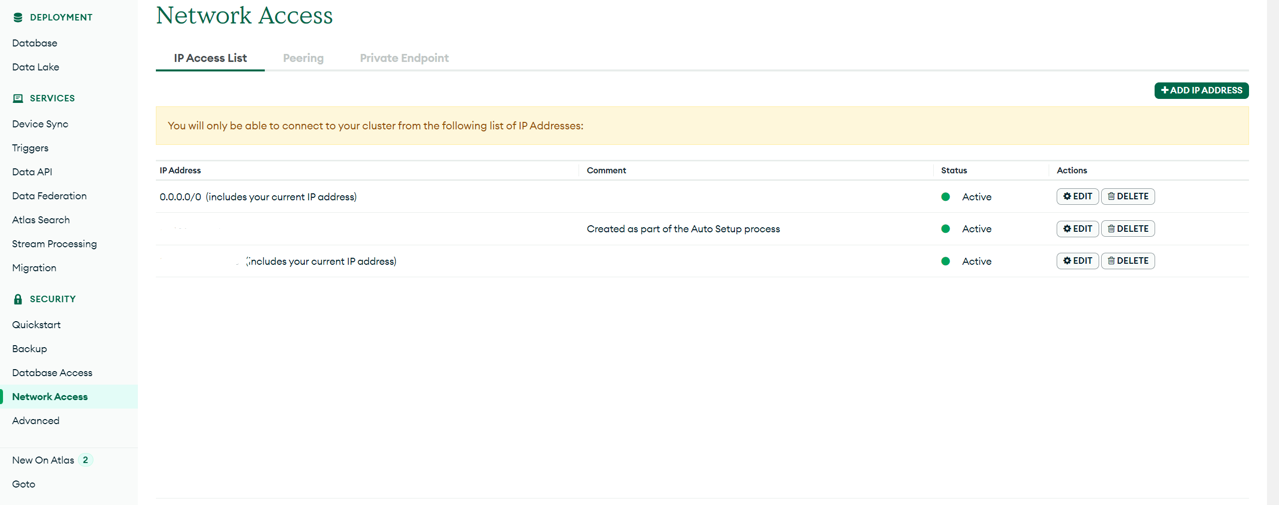 MongoDB Atlas에서는 기본적으로 사용자가 명시적으로 화이트리스트에 IP 주소를 추가하기 전까지, 모든 외부 접속은 차단된다. 데이터베이스에 접근하려면 관리자가 화이트리스트에 접근을 허용할 IP 주소를 추가해야 하고, 이 주소로부터의 접속만이 허용된다.