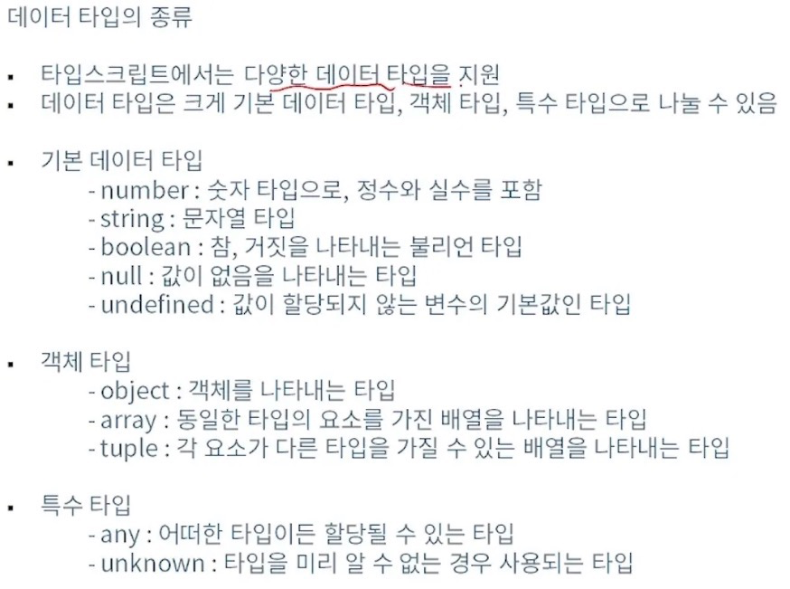 number : 숫자 타입 , 정수와 실수 를 포함string : 문자열 타입boolean : 참, 거짓을 나타내는 불리언 타입null : 값이 없음을 나타내는 타입undefined : 값이 할당되지 않는 변수의 기본값인 타입object : 객체를 나타내는 타입array : 동일한 타입의 요소를 가진 배열 을 나타내는 타입tuple : 각 요소가 다른 타입을 가질 수 있는 배열을 나타내는 타입any : 어떠한 타입이든 할당될 수 있는 타입unknown : 타입을 미리 알 수 없는 경우 사용되는 타입let x : string = "문자열 선언";