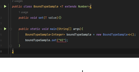 하지만 Integer는 Number의 서브타입이기 때문에 BoundTypeSample과 같은 선언이 가능하지만 set함수의 인자로 문자열을 전달하려고 했기 때문에 컴파일 에러가 발생한다.