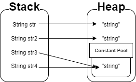 newμ°μ°μλ κ°μ²΄λ₯Ό μμ±ν λ μ¬μ©νκΈ° λλ¬Έμ Heapμ΄λΌλ λ©λͺ¨λ¦¬ μμμ λ€μκ³Ό κ°μ΄ κ°κ°μ λ©λͺ¨λ¦¬ 곡κ°μ ν λΉν΄ μ€λ€. newμ°μ°μλ‘ μμ±ν κ°μ²΄λ€μ λ©λͺ¨λ¦¬ μ£Όμκ° λ€λ₯΄κ² λμ€λ κ²μ΄λ€. νμ§λ§ 리ν°λ΄μ μ΄μ μ 곡λΆνλκ²μ²λΌ Heapλ©λͺ¨λ¦¬ μμ μμ μλ Constant Poolμ΄λΌλ λ©λͺ¨λ¦¬ μμμ ν λΉνκ²λκ³ λκ°μ κ°μ νΈμΆν λλ μ΄ μ μ ν λΉν΄ λμλ λ©λͺ¨λ¦¬ μ£Όμλ₯Ό λ겨μ€λ€.