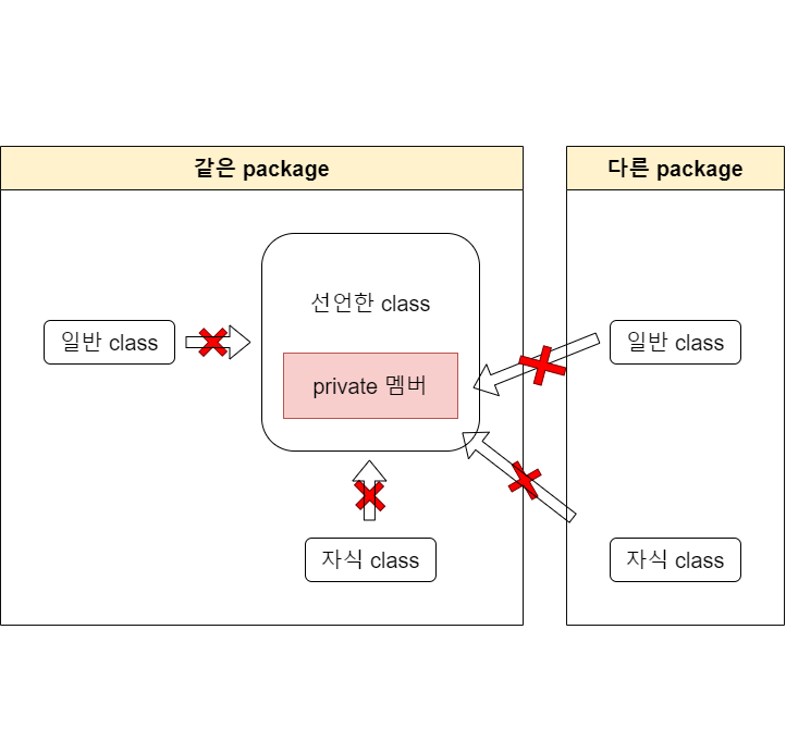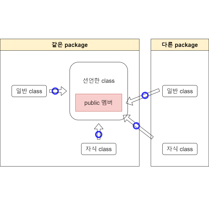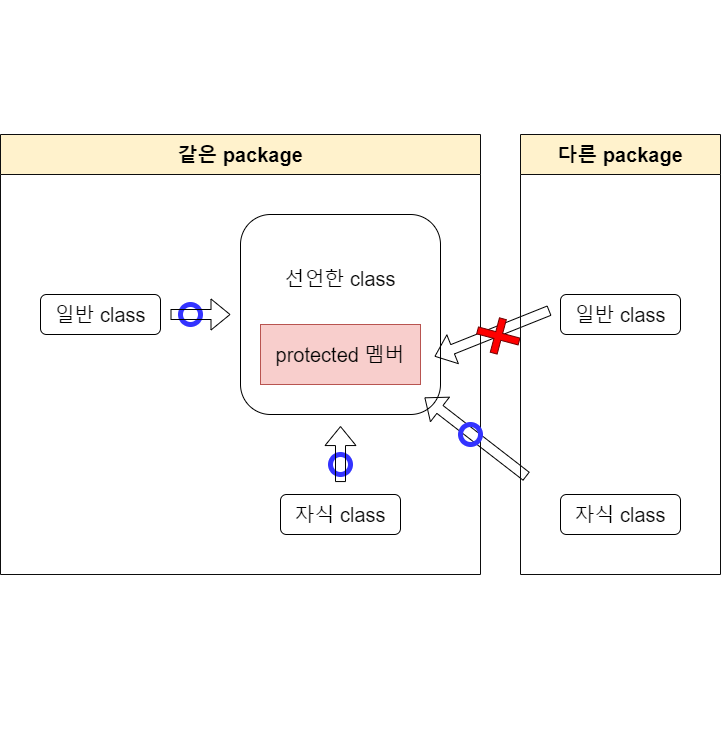 | ์ ๊ทผ ์ ์ด์ | ๊ฐ์ ํด๋์ค์ ๋ฉค๋ฒ | ๊ฐ์ ํจํค์ง์ ๋ฉค๋ฒ | ์์ ํด๋์ค์ ๋ฉค๋ฒ | ๊ทธ์ธ์ ์์ญ |