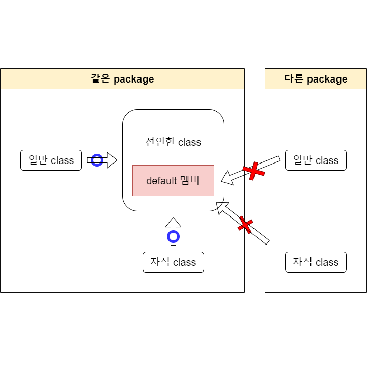 default ์ ๊ทผ์ ์ด๋ฅผ ๊ฐ์ง๋ ๋ฉค๋ฒ๋ ๊ฐ์ ํด๋์ค์ ๋ฉค๋ฒ์ ๊ฐ์ ํจํค์ง์ ์ํ๋ ๋ฉค๋ฒ์์๋ง ์ ๊ทผํ ์ ์๋ค.