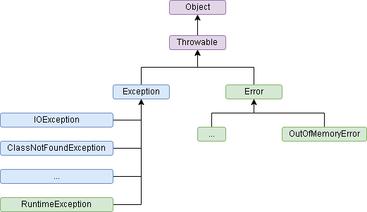 자바에서는 실행 시 발생할 수 있는 오류를 클래스로 정의한다. 위의 그림에서 파란색 부분은 Checked exception, 초록색 부분은 Uncecked exception이다. Checked exception은 컴파일 시점에서 확인될 수 있는 예외처리를 해주지않으면 컴파일에러가 발생한다. Unchecked exception은 컴파일 단계에서 확인되지 않는 예외로 프로그래머가 알아서 처리를 해야하는 영역이다.