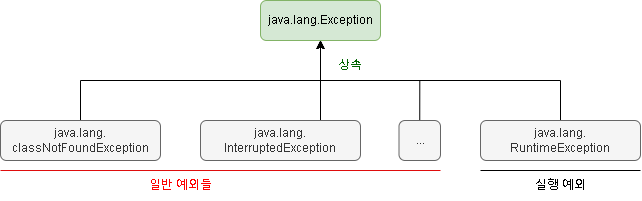 모든 예외 클래스는 java.lang.Exception 클래스를 상속받는다. RuntimeException와 그 외의 일반예외는 위에서 다룬 것처럼 Checked exception인지 Uncecked exception인지의 차이가 있다.