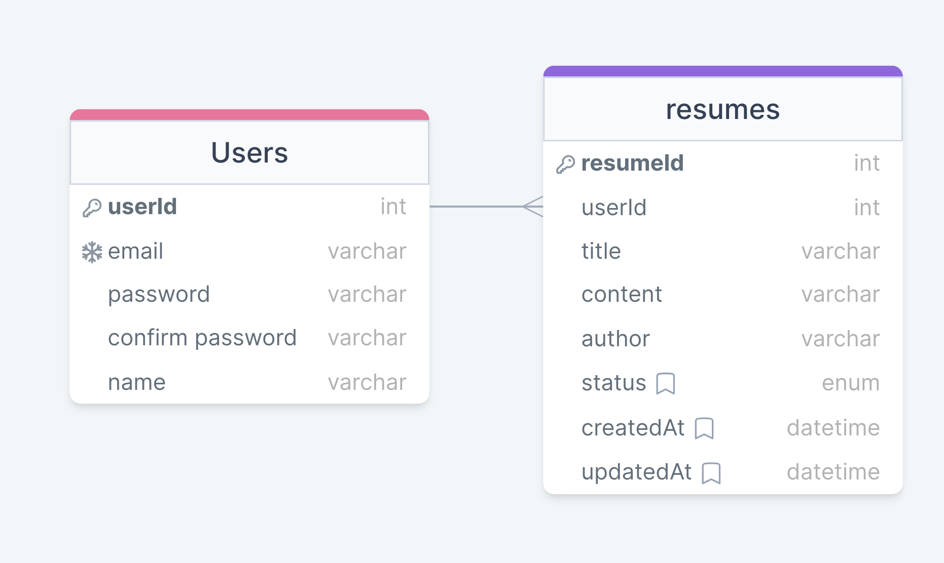 테이블과 컬럼들을 생성해주고, Users 와 Resumes를 1:N관계 설정해주었다.