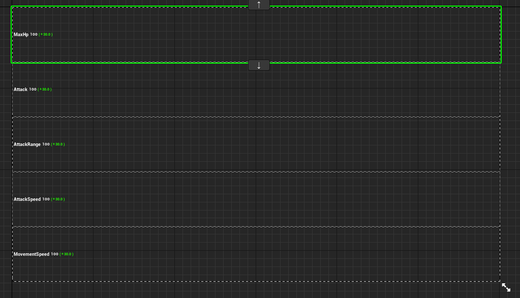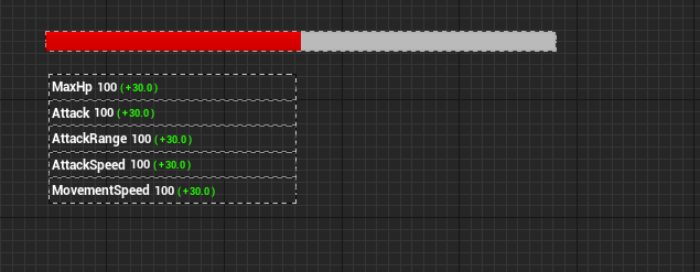 우리가 캐릭터 스탯에 넣었던 5가지 MaxHp,Attack,AttackRange,AttackSpeed 그리고 MovementSpeed를 각각 만들어서 넣어주고 VerticalBox를 가득 채우도록 한다.
