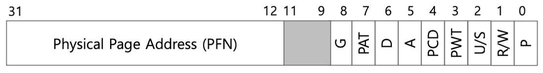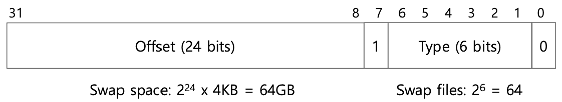 disk의 공간은 메모리보다 훨씬 크기 때문에 disk에서의 주소를 표현하려면 PFN보다 더 많은 수의 비트가 필요합니다. 따라서 위에서는 사용하지 않았던 비트도 모두 사용함으로써 더 큰 공간을 표현할 수 있습니다.