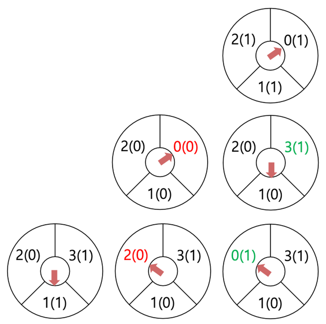 페이지가 처음 메모리에 적재되면 reference bit는 1로 설정됩니다. 이후 메모리 공간이 부족하여 어떤 페이지를 쫓아내야하는 상황이 발생하면, 바늘이 시계방향으로 돌면서 reference bit가 0인 페이지를 찾습니다. 이 때 reference bit이 1인 페이지를 만난다면 0으로 바꿔줍니다. 0인 페이지를 만나면 그 페이지를 swap space로 쫓아내고, 그 자리에는 swap in 된 페이지가 들어옵니다. 만약 메모리에 적재된 페이지에 재접근한다면 reference bit를 1로 만들기 때문에 최근에 접근한 페이지가 eviction 대상에서 빠져나갈 수 있습니다.