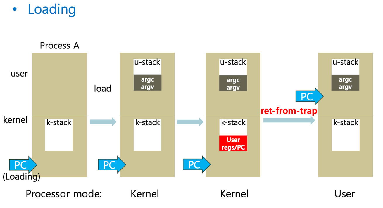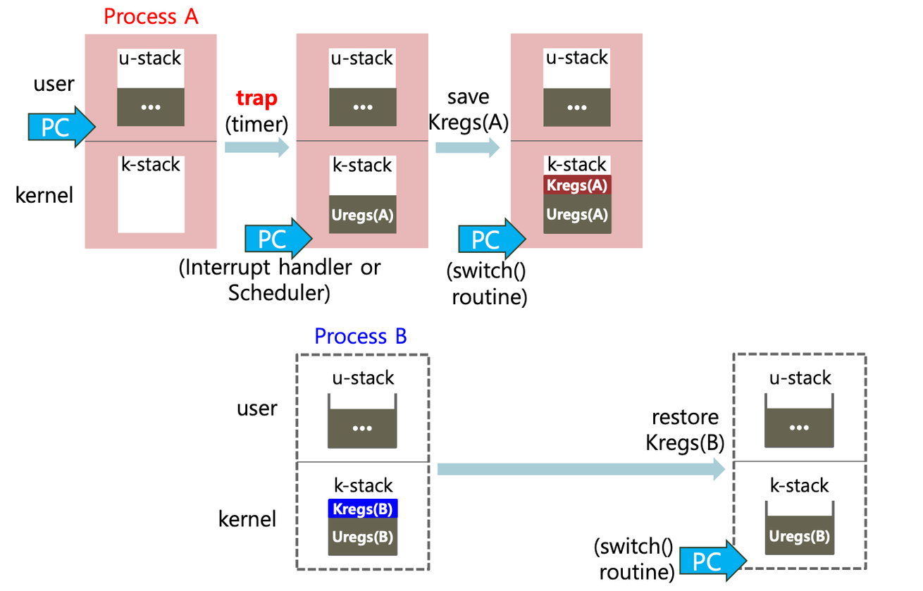 return-from-trap 명령어를 통해 프로세스 B로 이동합니다.4. CPU는 B의 kernel stack에 저장되어 있던 Uregs(B)를 복구하고, 프로세서 모드를 유저 모드로 전환한 후, B의 PC로 jump 합니다. -> 프로세스 B가 실행됩니다.