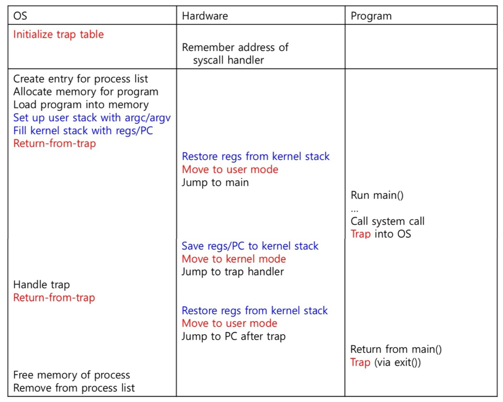 A. OS는 프로세스가 수행하고자 하는 제한된 작업이 무엇인지 확인하고 감시하기 위해 trap table을 사용합니다. 프로세스는 제한된 작업의 주소를 직접 명시할 수 없고 trap table의 인덱스만 명시할 수 있습니다.