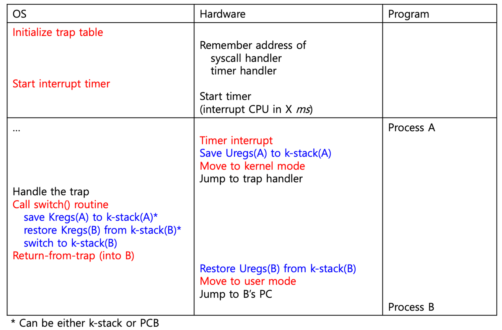 💥 이 방식에서 OS가 수동적인 역할을 하게 되며, 시스템 콜이나 에러 발생을 기다리는 것 외에는 할 수 있는 일이 제한됩니다. 만약 두 가지 모두 발생하지 않고 프로세스가 비협조적인 경우, OS가 자동적으로 제어권을 되찾을 수 있는 방법은 없습니다.