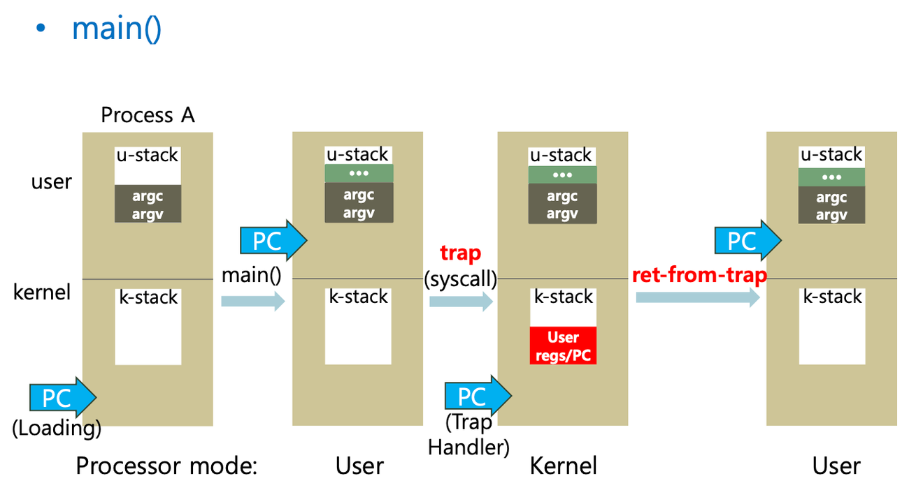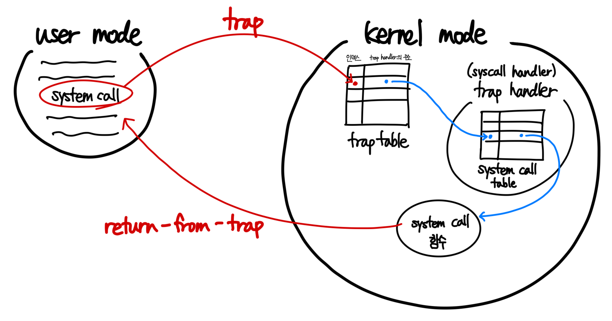system call 내부에서는 프로세서 모드를 커널 모드로 전환하기 위해 trap 명령어와 return-from-trap 명령어를 사용합니다.