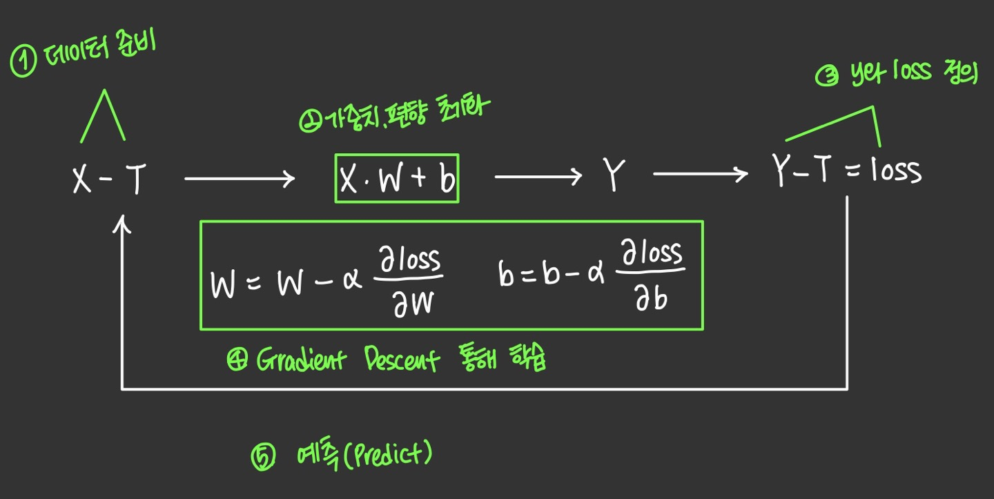 ※ 텐서플로, 케라스와 같은 라이브러리는 위의 5단계를 API를 통해 묶은 딥러닝 프레임워크