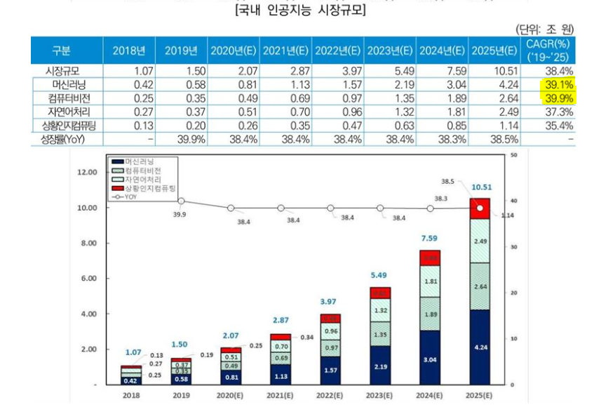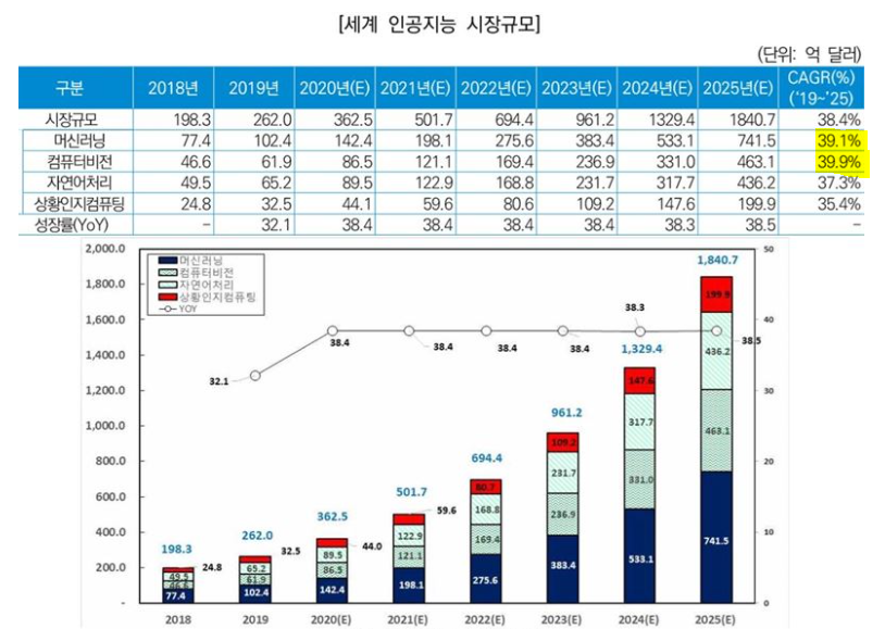 위 표의 CAGR(연평균 성장률)을 보았을 때 성장성이 가장 높은 인공지능 분야는 컴퓨터비전이다. 여기서 주목해야할 점은 컴퓨터비전과 자연어처리의 성장률 차이다. 컴퓨터비전의 경우 이미지와 같은 시각적인 부분을 처리하는 분야이고 자연어처리의 경우 사람들이 일상적으로 쓰는 언어, 자연적으로 발생된 언어를 처리하는 분야이다. 이 둘의 차이점은 지역적 제약의 유무이다. 컴퓨터비전이 처리하는 이미지나 영상의 경우 전세계적으로 지역적인 제약이 존재하지 않는다. 따라서 해당 데이터에 전세계적으로 동일한 알고리즘과 아키텍처를 적용하는 것이 가능하다. 그러나 자연어처리가 다루는 언어의 경우 알파벳과 한국어의 경우만 보아도 받침의 유무부터 다르다. 이는 전세계적으로 공통된 알고리즘과 아키텍처를 적용하는 것이 불가하다는 의미이자 각 지역별 알고리즘과 아키텍처를 구성해야 한다는 의미이다. 컴퓨터비전이 자연어처리보다 우세하다라는 말이 아니라 둘의 성장 속도가 다를 수 밖에 없다는 것이다.