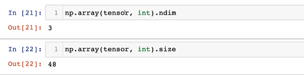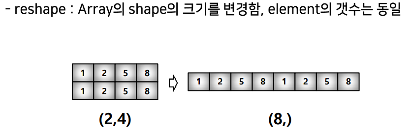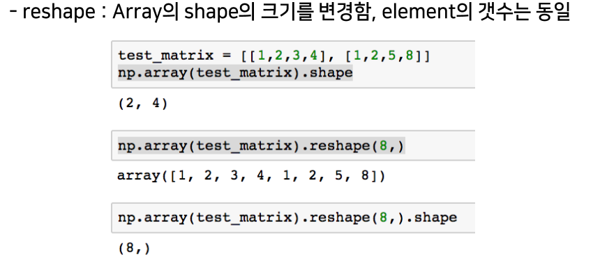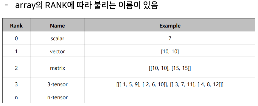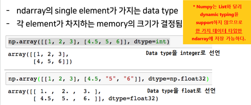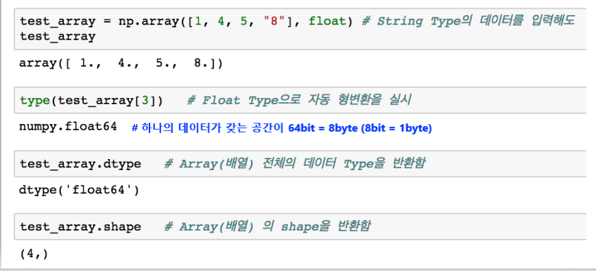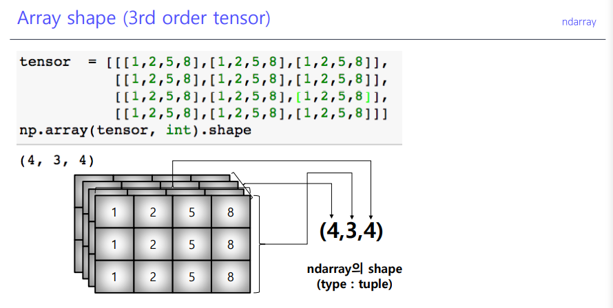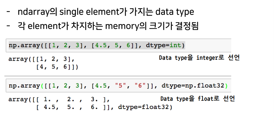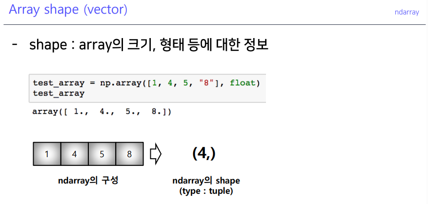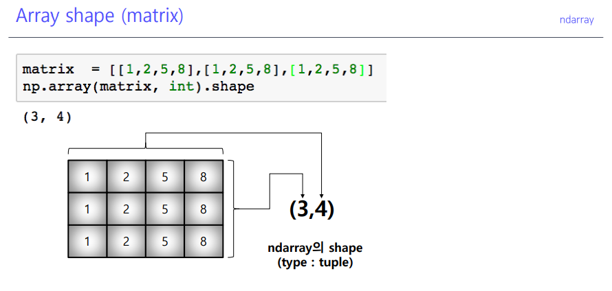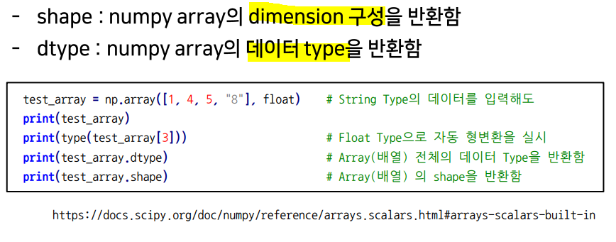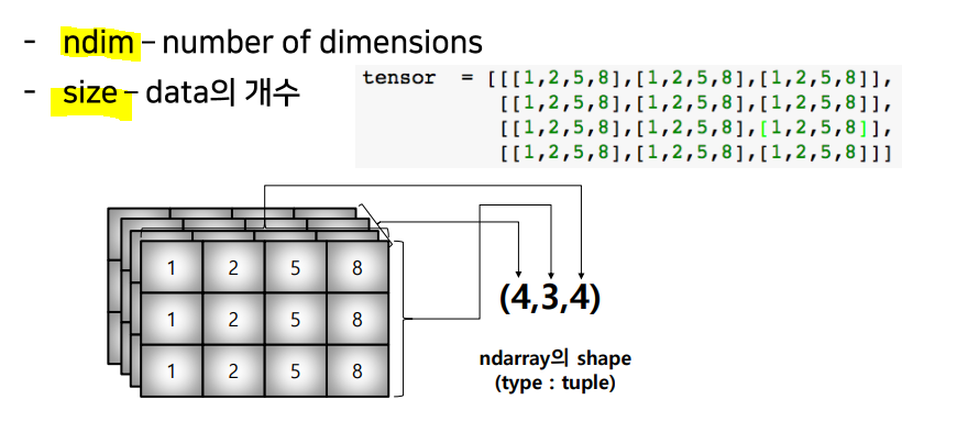 .shape : array(배열)의 크기, 형태 (tuple).ndim : dimensions(차원)의 개수.size : data의 개수numpy dtype